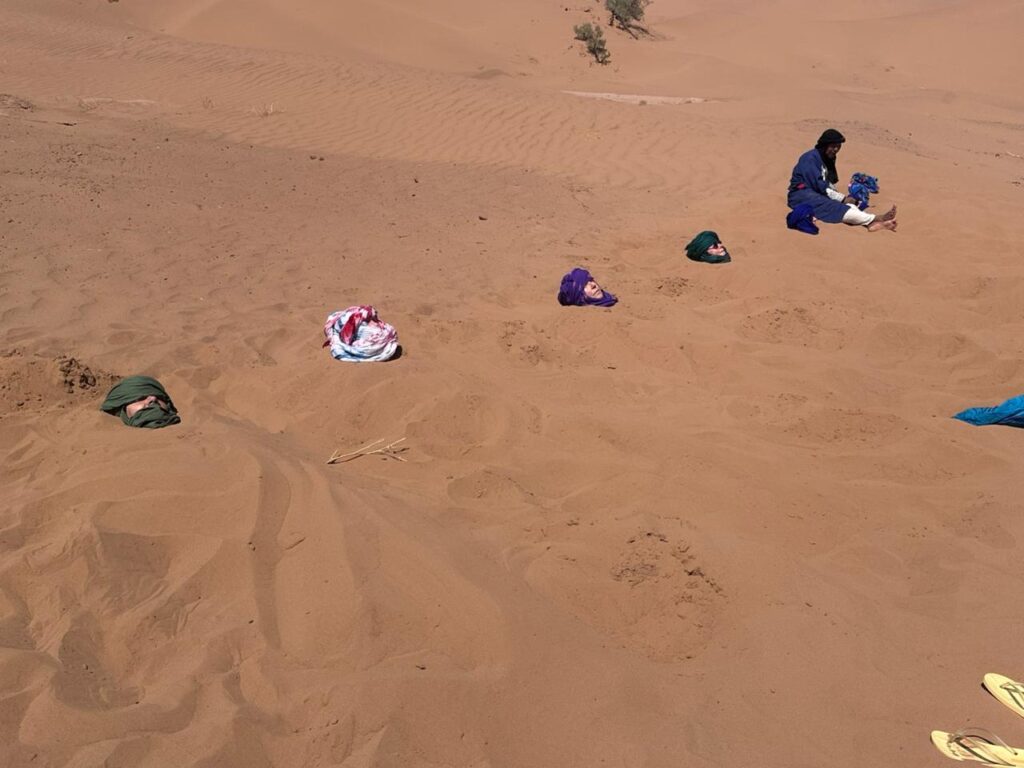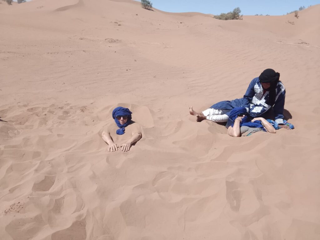 Les habitants du désert marocain savent depuis longtemps que le sable chauffé par le soleil cache des vertus insoupçonnées. En vous laissant enfouir quelques minutes sous une dune, vous profitez d’une chaleur pénétrante qui agit comme une thérapie naturelle.